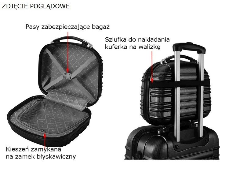 - Wewnątrz kuferka znajdują się szelki do podtrzymywania bagażu oraz kieszeń